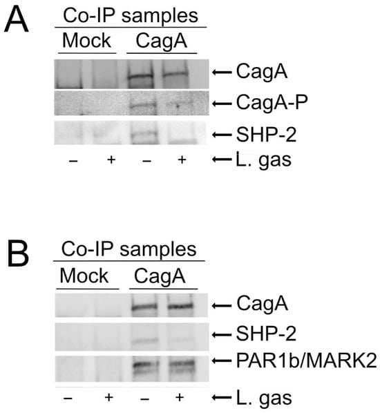 2.3. Inhibition of Phosphorylation of CagA by L. gasseri Reduces CagA Interaction with the SHP-2 Phosphatase