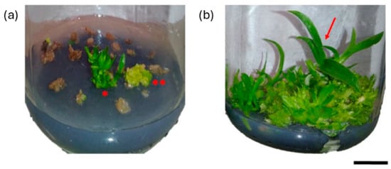 Effects of colchicine on in vitro protocorm survival of Blc. Haw Yuan Beauty × Blc. Goldenzelle “LC”: (a) protocorms cultured in MS medium for 120 days after treatment with colchicine at a concentration of 1000 µM and exposure time of 24 h, showing dead tissues, regeneration of PLBs **, and plantlets *; (b) control treatment with protocorms in plant regeneration (red arrow). Scale bar = 1 cm. Reproduced with permission from Vilcherrez-Atoche, 2023 [], CC-BY license, Copyright © 2023, the authors. Licensee MDPI, Basel, Switzerland.