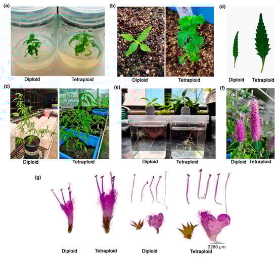 Phenotype characteristics and chromosome number of diploid and tetraploid Elsholtzia splendens. (a) Comparison of phenotype characteristics of different ploidy-level plants at tissue culture stage. (b) Different ploidy-level plants were transplanted into soil. (c) Phenotype characteristic comparison of different ploidy-level plants at adult stage. (d) Leaf morphology of two different ploidy-level plants at adult stage. (e) Tetraploid plants produced more lateral roots. (f) Tetraploid inflorescence displayed increased length. (g) Anatomical diagram comparison of one floret between diploid and tetraploid. Reproduced with permission from Liu et al., 2024 [], CC-BY license, Copyright © 2024, the authors. Licensee MDPI, Basel, Switzerland.