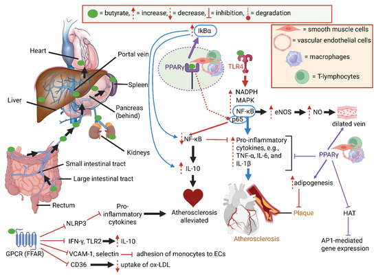 Butyrate produced by gut microbiota, mainly in the large intestine, enters the portal vein and is distributed to various organs (a few listed here). Interaction with Toll-like receptor 4 (TLR4) leads to an increase in nicotinamide adenine dinucleotide phosphate (NADPH), mitogen-activated protein kinase (MAPK), and nuclear factor kappa B (NF-κB). The latter activates the expression of endothelial nitric oxide synthase (eNOS), and nitric oxide (NO) levels increase, which acts as a vasodilator. NF-κB stimulates the formation of proinflammatory cytokines (e.g., TNF-α, IL-6, and IL-1β) and initiates plaque formation. The binding of butyrate to peroxisome proliferator-activated receptor γ (PPARγ) downregulates NF-κB production and upregulates the production of anti-inflammatory cytokines such as IL-10. The latter suppresses atherosclerotic activities. PPARγ suppresses the production of proinflammatory cytokines and the activity of histone acetylase (HAT). By suppressing HAT, DNA is not acetylated, and genes are not expressed. PPARγ also stimulates the activity of IkBα, an inhibitor of the NF-κB pathway, and promotes the production of anti-inflammatory cytokines such as IL-10. PPARγ also induces adipogenesis and prevents the accumulation of lipids on atrial walls and plaque formation (shown as a red, healthy heart). The binding of butyrate to G-protein-coupled receptors (GPCRs) suppresses the production of interferon γ (IFN-γ), TLR2, and Nod-like receptor pyrin domain 3 (NLRP3), and downregulates the production of adhesion molecules such as vascular cell adhesion molecule 1 (VCAM-1) and E-selectin—all suppressing the production of proinflammatory cytokines. The suppression of interferon γ (IFN-γ) and Toll-like receptor 2 (TLR2) by butyrate suppresses the activity of the glycoprotein CD36 and decreases the uptake of oxidized low-density lipoprotein (ox-LDL) by macrophages. ECs = endothelial cells, AP1 = activator protein-1, red heart symbol = a healthy heart (atherosclerosis alleviated). The interactions between compounds are shown by using different colored arrows. The dotted line between PPARγ and p65 refers to ligation. The schematic representation was constructed using Biorender (Biorender.com), accessed on the 18 June 2025.