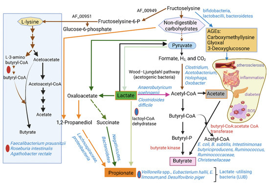Fructoselysine is a key intermediate in the formation of advanced glycation end products (AGEs), such as carboxymethyllysine [96] and reactive α-dicarbonyls (i.e., glyoxal and 3-deoxyglucosone; blue line to brown box) [97]. AGEs attach to proteins and may lead to plaque buildup in arteries [98]. AGEs are also associated with chronic inflammation, diabetes, Crohn’s disease [99,100], and oxidative stress (listed in the light-yellow area) [101]. In a microbially balanced GIT, fructoselysine and AGEs are degraded to butyrate by Escherichia coli, Bacillus subtilis, Intestinimonas butyriciproducens, Ruminococcus spp., and members of the families Ruminococcaceae and Christenellaceae [85,86].