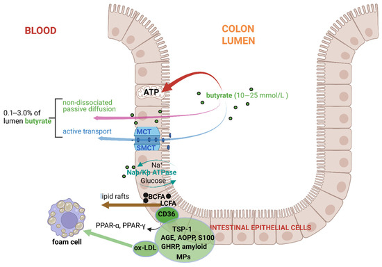 Butyrate, absorbed by colonocytes in the proximal colon, enters the TCA cycle to produce ATP (red arrow). Butyrate that crosses the gut wall, either by diffusion (pink arrow) or with the assistance of proton-coupled monocarboxylate transporters (MCTs) and sodium-coupled monocarboxylate transporters (SMCT), depicted in blue, enters the circulatory system. Butyrate is also transferred across the gut wall by transmembrane glycoprotein CD36 (cluster of differentiation 36), which has a high affinity for oxidized low-density lipoprotein (ox-LDL), shown in green circles. Ox-LDL is taken up by specific macrophages (foam cells). CD-36 also binds to proteins such as thrombospondin (e.g, TSP-1); advanced glycation end products (AGEs); advanced oxidation protein products (AOPPs); S100 family proteins S100-A8, S100-A9, and S100-A12 that bind Ca2+; growth hormone-releasing peptide (GHRP); cell-derived microparticles (MPs); and amyloids. Branched-chain fatty acids (BCFAs) and long-chain fatty acids (LCFAs) are transported across the plasma membrane via “lipid rafts” (brown arrow). The green dots denote butyrate, and the black dots BCFAs. The schematic representation was constructed using Biorender (Biorender.com), accessed on the 18 June 2025.