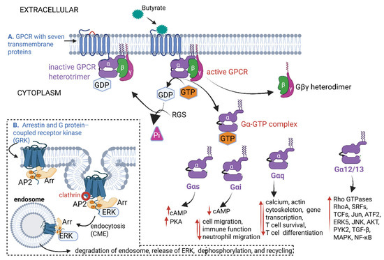 A schematic representation of activities stimulated and repressed when butyrate (blue-green dots) binds to G-protein-coupled receptors (GPCRs). (A) With the attachment of butyrate to the GPCR, the G-protein complex is activated. Upon dissociation of the Gα-protein from the Gα-GTP complex, several cellular reactions are stimulated (red arrow pointing upwards) and repressed (arrow pointing downwards). (B) Arrestin proteins (Arr) attach to extracellular signal-regulated serine/threonine kinase (ERK), adaptor protein 2 (AP2, orange circles), and clathrin (red circle) to form a clathrin-coated pit. The clathrin-coated pit splices off the plasma membrane and is taken up by a clathrin-coated vesicle (endosome). ERK released from degraded and dephosphorylated endosomes is recycled and either stimulates atherosclerogenic processes or inhibits atherosclerosis (AS) by removing apoptotic cells. RGS = regulator of G protein signaling; Gαs = Gα stimulatory protein; Gαi = Gα inhibitory protein; Gαq = Gα ubiquitous protein; Gα12/13 = Gα signaling protein; cAMP = cyclic adenosine monophosphate; PKA = cAMP-dependent protein kinase; Rho = transcription termination factor; SRF = serum response factor (a transcription factor); TCF = T-cell factor/lymphoid enhancer factor (a transcription factor); Jun = transcription factor complex, which is a key component of AP2 (Activator Protein-2); ATF2 = activating transcription factor 2; MAPK = mitogen-activated protein kinase; JNK = c-Jun N-terminal kinase; AKT or PKB = protein kinase B (a serine/threonine kinase); NF-κB = nuclear factor kappa B; TGF-β = transforming growth factor β. The schematic representation was constructed using Biorender (Biorender.com), accessed on the 18 June 2025.