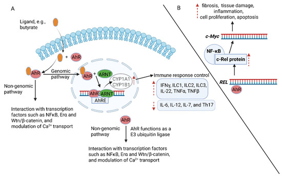 AhRs attach to multiple molecules, e.g., SCFAs (including butyrate); indole-3-acetic acid and indole-3-aldehydes produced from the degradation of tryptophan (Trp); halogenated aromatic hydrocarbons (HAHs); polycyclic aromatic hydrocarbons (PAHs), such as pyrenes, 2,3,7,8-tetrachlorodibenzo-p-dioxin (TCDD); polyunsaturated fatty acids such as arachidonic acid (AA); and flavonoids (pyrene linked to two benzene rings) [203,204,205,206]. In the genomic signaling pathway, butyrate activates AhR and transfers the butyrate-AhR complex to the nucleus, where it binds to the aryl hydrocarbon receptor nuclear translocator (ARNT) and the AhR element (AhRE) (Figure 5A). The butyrate-induced AhR-ARNT-AhRE complex promotes the transcription of several genes, e.g., cytochrome P450 family 1 subfamily A member 1 (CYP1A1), CYP1B1, and cytokines IL-1, IFNγ, IL-C1, IL-C2, IL-C3, IL-22, TNFα, and TNFβ (Figure 5A) [199]. AhR also suppresses the production of cytokines, such as IL-6, IL-12, IL-7, and Th17 (Figure 5A) [195]. In the non-genomic pathway (Figure 5A), AhR functions as an E3 ubiquitin ligase. The released c-SRC kinase phosphorylates multiple targets, e.g., regulating protein degradation. These non-genomic pathways modulate immune responses, inflammation, and calcium transport across cell membranes (Figure 5A) [207,208]. The binding of AhR to the proto-oncogene REL encodes the c-Rel protein, a subunit of NF-κB that activates the transcription of the c-Myc gene (Figure 5B). The latter drives organ fibrosis in tissue remodeling or tissue damage and regulates inflammation, proliferation, apoptosis, and certain cancers [209,210]. A homolog of c-Rel, v-rel avian reticuloendotheliosis viral oncogene homolog A (RELA), found in the avian retrovirus Rev-T, regulates the expression of AhR in VSMCs [211], stimulating their development [212]. An increase in IL-22 levels prevented inflammation of the GIT [213,214].