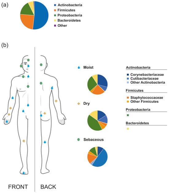 (a) General overall composition of normal human skin microbiota; (b) Difference in composition of microbiota across different parts of human skin: moist, dry and sebaceous. Figure based on data from Grice et al. [].