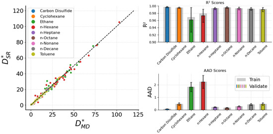 This obtained form reflects the expected physical behavior, where is inversely proportional to and proportional to , which follows the qualitative trend found during the preprocessing analysis in Section 3.3. Regarding the accuracy of the expressions, a collective identity plot of the nine dedicated expressions along with their and values is presented in Figure 1. To improve the robustness of the results, a repeated k-fold cross-validation [43] has been performed, and the average and values are shown, with the error bars corresponding to the standard deviations. Colored bars represent the validation dataset metrics, while training bars are shown in light gray color. Overall, the molecular fluid dedicated expressions exhibit fine accuracy, achieving in most cases values higher than 0.98 and lower than 0.5. Small deviations occur only for the ethane and n-hexane fluids, where, although their values are higher than 0.96, the respective is notably higher than every other fluid. From Table 2, we observe that for ethane ranges from 6.475 to 77.694 and for n-hexane from 3.621 to 102.942, both significantly wider compared to the other fluids. This has a profound effect on the statistical accuracy of the predictions for these two fluids. To increase the accuracy, if unsatisfactory, we would need more datapoints from MD simulations.