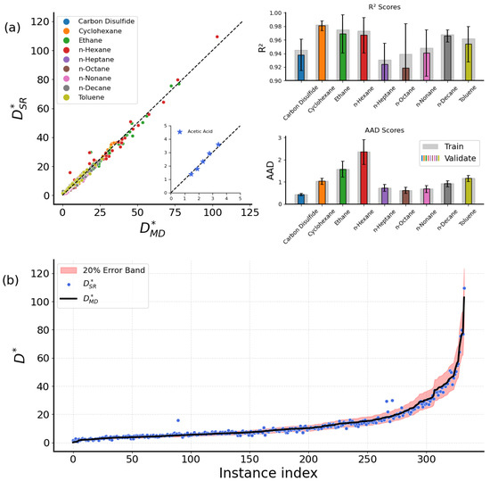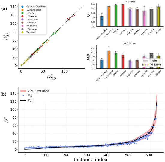 In addition, Figure 2b compares all the available values from both MD and SR. Most prediction values fall within an 20% error band. However, deviations exist for lower values. In light of the above, the all-molecule universal expression of Equation (4) can serve as an alternative to the dedicated ones, offering greater generalization capabilities while simultaneously achieving results comparable to those of the dedicated expressions.