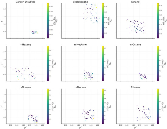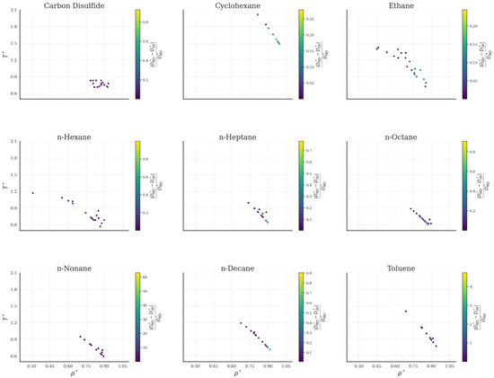 The prediction performance of the bulk fluids is further investigated in Figure 3 across the phase space (). Datapoints color accounts for the relative absolute error with respect to data. It seems that the all-fluid universal SR expression Equation (4) effectively captures the behavior. Although certain datapoints for specific fluids show differences between the predicted and simulated values, these deviations do not exhibit a consistent pattern with respect to their or values.
