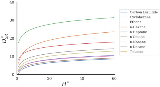 The SR-derived self-diffusion coefficient from Equation (5) vs. for nine molecular fluids inside nanochannels.