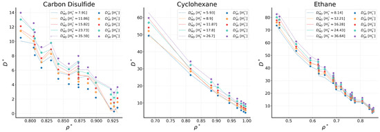 To investigate this behavior, Figure 4 presents the values of vs. when and are kept constant at the corresponding mean values of the dataset. The expression yields values for which the rate of increase progressively decreases, with approaching a nearly constant value. Therefore, the expression in Equation (5) captures the expected physical behavior and is consistent with well-established MD results reported in Giannakopoulos et al. [37] for pure LJ fluids.