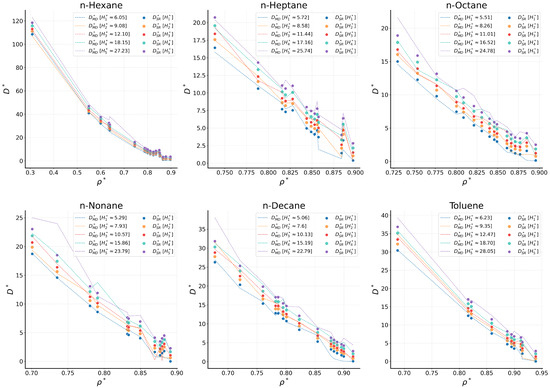 Moreover, empirical relations [30] have been employed, along with recent ML methods based on simulation data [10,31]. It has been reported that D is linearly dependent on temperature [11,28,31,32,33,34] as higher temperatures enhance thermal movement and promote diffusion. In terms of density, , an inversely proportional relationship between D and is also observed. This behavior is consistent with the physical behavior of the system since low-density fluids have shown higher D values. In the case of confined systems (i.e., nanochannels), the pore size is also a key parameter. For instance, fluid diffusion coefficients have been found to increase with channel width [35,36,37], while D approaches its bulk value as the channel width increases beyond a certain point [37,38]. It has also been reported that, for large pore sizes, D may even exceed the bulk values [39].