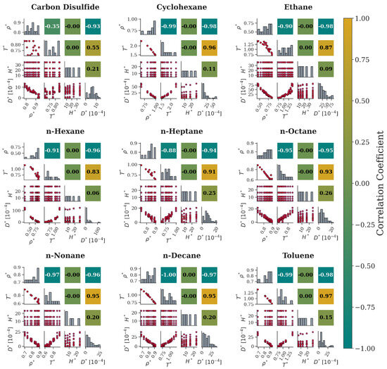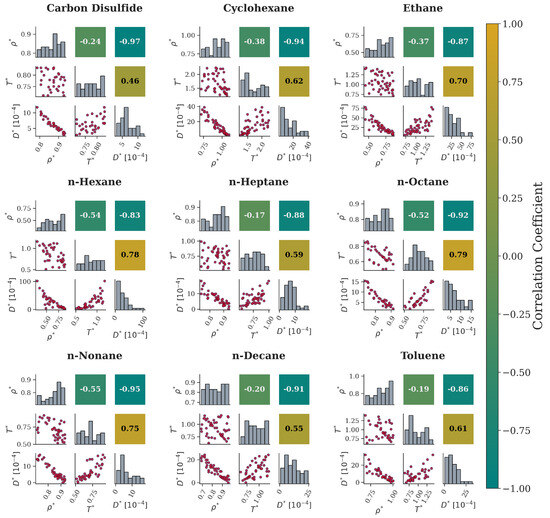 For the nanochannel system (Figure 10), the same qualitative relationship between and is also observed for all the fluids. Moreover, continues to hinder diffusion since it is seen that decreases with the corresponding density increase with an apparently linear relationship, as shown by the scatterplots and Pearson correlation coefficients. Similarly, a temperature increase enhances diffusion in a nearly linear manner. This trend is more evident in most cases except for carbon disulfide and, to a smaller extent, n-hexane. For these two cases, the corresponding scatterplots provide initial evidence that is additionally confirmed by their Pearson values. Finally, the nanochannel width, , has seemingly no linear correlation with for any fluid under consideration, as depicted in their scatterplots. This is also validated by the Pearson values, which indicate the presence of a non-linear correlation.
