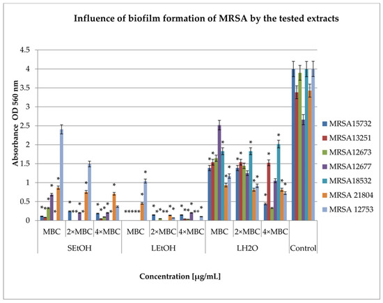 The study results (Figure 1) show that the highest degree of inhibition of biofilm formation was observed in the case of LEtOH, ranging from 74% for the MRSA12753 strain (MBC concentration; p < 0.05) to 100% for the MRSA18532 strain (all tested concentrations; p < 0.05). The SEtOH extract caused a reduction in biofilm formation from 40% against the MRSA12753 strain (MBC concentration) to 100% against the MRSA18532 strain (all tested concentrations; p < 0.05). The LH2O extract showed a varying degree of reduction, ranging from 5% against the MRSA12677 strain (MBC concentration) to 91% against the MRSA12677 strain (4 × MBC concentration; p < 0.05).