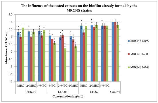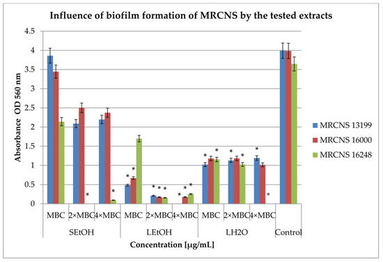 Studies on the effect of three extracts on the formed biofilm were carried out at three concentrations: MBC, 2 × MBC, and 4 × MBC. The results for MRSA and CNS strains are presented in Figure 3 and Figure 4, respectively.