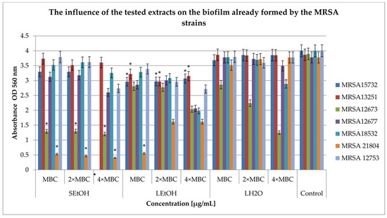 Figure 3 shows the effect of extracts on MRSA strains in the formed biofilm. The impacts of various impacts on the development of biofilm of MRSA strains were observed. The SEtOH extract inhibited further biofilm growth in the range from 3% (MBC concentration) against the MRSA13251 strain to 100% (4 × MBC; p < 0.05) against the MRSA15732 strain. The LEtOH extract inhibited biofilm development from 15% against the MRSA12753 strain (MBC concentration) to 57% against MRSA 21804 (concentration 2 × MBC and 4 × MBC; p < 0.05). In turn, the LH20 extract was not active against the MRSA 12677 strain in the MBC concentration, and against the MRSA 13251 strain in all tested concentrations. In addition, its activity was demonstrated in inhibiting the development of biofilm from 1% against the MRSA12677 and 21804 strains in a concentration of 2 × MBC to 67% against MRSA 12673 in a concentration of 4 × MBC.
