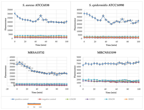 The presented results (Figure 5) show a high level of fluorescence in the case of the positive control, gramicidin. However, the extracts did not cause the rupture of the cell membrane in the cells of the bacterial strains, which is visible from the close-to-zero level of fluorescence of the marker present in the samples. A slightly higher level of fluorescence was noted in the samples where the MRCNS13199 strain was used.