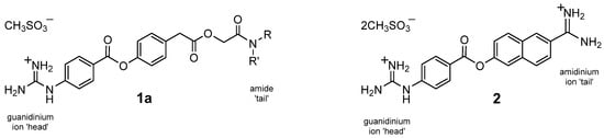 The physiological functions of TMPRSS2 remain incompletely defined, and evidence from proven inhibitors suggests that the disruption of this protease may incur only minor side effects. For example, MM3122, a potent and selective ketobenzothiazole peptidomimetic, reversibly covalent inhibitor of TMPRSS2, is a lead antiviral candidate for clinical development, which exhibits metabolic stability and a favourable safety profile in mouse models []. Camostat mesylate (1a, Figure 1; MW: 494.6 g/mol) and the structurally related drug nafamostat mesylate (2; MW: 539.6 g/mol) similarly disruptively bind TMPRSS2 within its catalytic cleft [,]. These synthetic guanidinium-functionalised drugs are already clinically approved in Japan and South Korea for a variety of roles in anticoagulant therapy and the treatment of pancreatitis pain and reflux esophagitis.