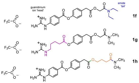 Computational methods have long been instrumental in identifying drug repurposing opportunities for viral diseases [,]. In the TMPRSS2 binding of camostat and nafamostat, both drug-bound protease crystal structures and in silico molecular docking studies reveal two interactions that are key to complex formation [,]. Firstly, the N-terminal cationic guanidinium ‘head group’ forms a salt bridge with anionic Asp435. Once docked via this and other non-covalent attractions, the catalytic Ser441 becomes acylated by the central aromatic ester of camostat, such that the drug acts irreversibly as a suicide inhibitor []. However, since acylation is not instant [,], it seems the initial non-covalent docking is key to pre-organising the orientation and conformation of the drug within the catalytic site. Though initially driven by the electrostatic salt bridge formation, structural specificity and binding contributions from the rest of the molecule remain less clear. This uncertainty is highlighted by the considerable C-terminal ‘amide tail’ functional differences among the otherwise related guanidinium-based protease inhibitors camostat (1a, aliphatic dimethyl amide), nafamostat (2, aromatic amidinium cation) and gabexate (aromatic ethyl ester). Even the dominant natural metabolite of camostat oral administration, GBPA (4-(guanidinobenzoyloxy)phenylacetic acid, also called FOY-251), retains some of the parent drug’s inhibitory potency, despite its structure being significantly truncated at the C-terminus [,,]. These structural divergences suggest that the C-terminal region may influence the binding affinity and consequent propensity for covalent adduct formation with TMPRSS2. Therefore, in the present study, modification at the C-terminus was prioritised to probe how this region contributes to protease disruption—an aspect underexplored in previous SAR initiatives.