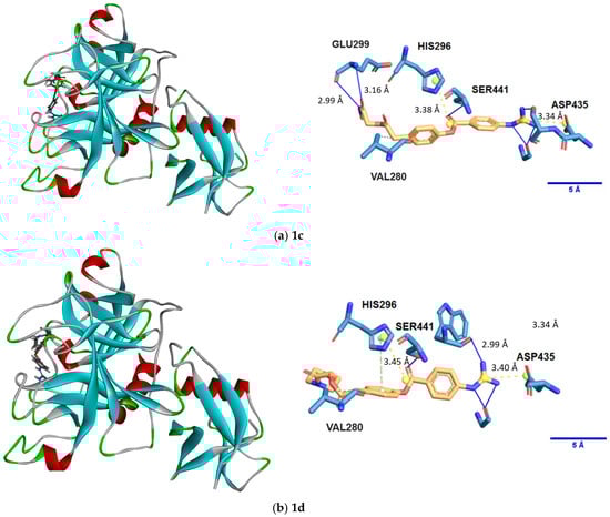 Modelling revealed that both of the strongest binding analogues, 1c and 1d, form similar interactions with the protease binding pocket residues (Figure 3). Consistently evident are the salt bridge to Asp435 and consequent preorganisation of the electrophilic aromatic ester adjacent to Ser441. Further along the drug scaffold, 1c also forms hydrogen bonds from its secondary amide ‘tail’ to Glu299 and a nearby hydrophobic contact with Val280. By contrast, 1d appears to lack hydrogen bonding to Glu299, probably on account of the absence of an NH in the morpholino (tertiary) amide. Although this absence is interpreted as a loss of a stabilising interaction, the overall docking score of 1d remains comparable to that of 1c. This suggests that the morpholino ring may confer compensatory advantages, such as an entropy-driven enhancement of the hydrophobic contact area.