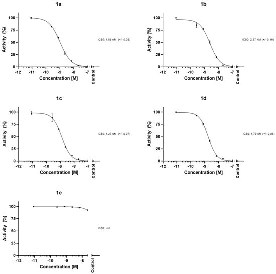 IC50 values from in vitro TMPRSS2 enzyme inhibition activity for camostat analogues 1a to 1e. IC50 stated ± SEM (standard error on the mean) Camostat was used as the control (10 µM) for maximum inhibition. The data shown are the average of two independent experiments, each performed with duplicate samples (N = 4). nd = not determined.