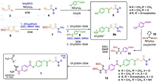 N,N′-Di-Boc-1H-pyrazole-1-carboxamidine (10) and bromoacetyl bromide, 4-aminobenzoic acid, 4-aminophenylacetic acid, 4-hydroxyphenylacetic acid, glycine, triethylamine, EDCI, DMAP, DIPEA, di-tert-butyl dicarbonate and trifluoroacetic were purchased from Fluorochem Ltd. (Glossop, UK). Dimethylammonium hydrochloride and methylammonium hydrochloride were purchased from ThermoFisher Scientific Inc. UK (Altrincham, UK) and morpholine from Alfa Aesar UK (Loughborough, UK). The progress and success of chemical reactions were monitored by 1H-NMR and reversed-phase LC-MS (Figures S1–S18). NMR spectra were obtained using a JEOL ECZR 400 (1H 399.78 MHz) or JEOL ECA 500 (1H 500.16 MHz) spectrometer (JEOL Ltd., Tokyo, Japan) and are reported relative to the residual solvent reference chemical shifts. LC-MS analysis was performed on a Shimadzu LC-2020 system featuring a Shimadzu LC-2050C chromatograph (Shimadzu UK Limited, Milton Keynes, UK) in conjunction with a reversed-phase column (H2O-MeCN; a 2-min MeCN hold extended run time for all di-BOC compounds to ensure elution).