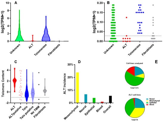 Identification of ALT cell lines. (A): TERT expression in cell lines with known and unknown telomere maintenance mechanisms (TMM). (B): Magnification of data in A; dotted line represents cut-off value for TERT expression: unknown cell lines with values above this threshold are classified as putative telomerase-positive, those below as putative ALT. (C): Telomere length evaluated by TelSeq; putative ALT cell lines with telomere content values below the threshold (shown as a dotted line) are discarded. (D): ALT incidence in different types of tumors. (E): percentage of types of tumors among all the cell lines analyzed (above) and among the ALT cell lines (below).