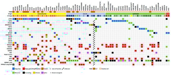 Other frequently altered genes are RB1 and MYC (a well-known oncosuppressor and oncogene, respectively), NF1 (known for being often mutated in neural tumors), and PAXX (often fused with FOXO1 in alveolar rhabdomyosarcomas).