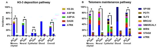 Incidence of damaging alterations of ALT repressor genes. (A): genes belonging to the H3.3 histone deposition pathway. (B): genes belonging to the telomeric integrity maintenance pathway. Asterisks represent significant differences, ns: not significant (statistical test was not performed on blood cell lines, since only 2 are ALT-positive). Incidence values are calculated from 76 ALT-positive and 1299 telomerase-positive cell lines.