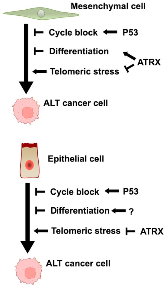 In conclusion, viewing ALT establishment as a “multi-hit” process, we hypothesized the need for inactivation of the p53 pathway (in order to cope with replication and telomeric stress [55,56]), of the “telomeric integrity maintenance” pathway (causing de-repression of telomeric recombination) and of other ones (yet to be discovered) that may be lineage specific. As in mesenchymal and neural cells, one of these unknown pathways may rely on ATRX, the inactivation of this gene “kills two birds with one stone” (de-repression of telomeric recombination and lineage-specific pathway) in these lineages but gives only one “hit” in epithelial cells (de-repression of telomeric recombination), explaining the higher incidence of ATRX inactivation in the former (Figure 5). As we have helped to identify more ALT epithelial cell lines, our last recommendation is to perform more studies on these in order to have a clearer understanding of the ALT phenomenon.