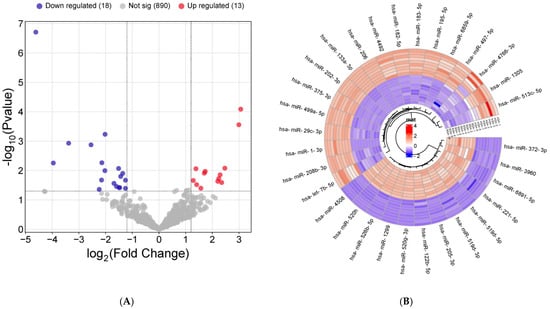 Small RNA sequencing was successfully performed in n = 9 AGA and n = 10 SGA cord blood-derived exosomal samples and identified a total of 1241 miRNAs. Of these, 921 miRNAs were shared by the AGA and SGA subgroups (Figure 1A); 125 miRNAs were exclusively detected within the AGA subgroup (Table S1); and 195 miRNAs were only found in the SGA subgroup (Table S2). Thirty-one miRNAs (out of 921) were dysregulated in SGA infants (n = 18 down-regulated and n = 13 up-regulated) (Figure 1A,B).