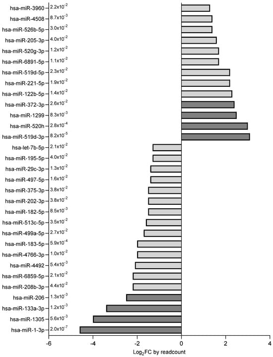 Differentially expressed miRNAs (n = 31) were ranked according to their fold change. miRNAs depicted in dark grey (FC ≤ −2.4 or ≥2.4, p < 0.05) were selected for validation in the entire study population of AGA (n = 40) and SGA (n = 35) infants.