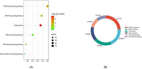 The database for annotation, visualization and integrated discovery (DAVID) was used to perform pathway enrichment analysis of predicted targets (Table 2). KEGG pathway analysis, including the target genes of all differentially expressed miRNAs, revealed the top six most enriched pathways, namely, phosphatidylinositol 3-kinase/protein kinase B (PI3K-Akt) signaling, mitogen-activated protein kinase (MAPK) signaling, endocytosis, transforming growth factor (TGF) beta signaling, Ras-associated protein 1 (RAP1) signaling and neurotrophin signaling (Figure 5A). Insulin signaling accounted for 44% of total target genes, followed by endocytosis (20%), TGF beta signaling (11%), RAP1 signaling (15%) and neurotrophin signaling (10%) (Figure 5B).
