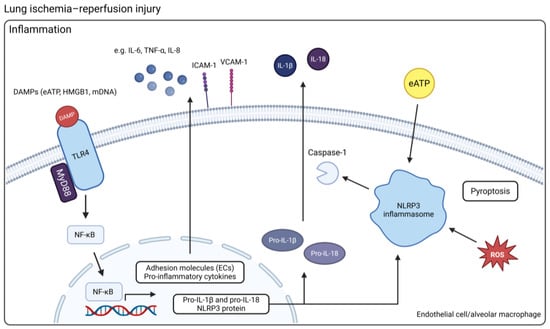 - Zhou, P.; Guo, H.; Li, Y.; Liu, Q.; Qiao, X.; Lu, Y.; Mei, P.; Zheng, Z.; Li, J. Monocytes promote pyroptosis of endothelial cells during lung ischemia-reperfusion via IL-1R/NF-κB/NLRP3 signaling. Life Sci. 2021, 276, 119402. [Google Scholar] [CrossRef] [PubMed]