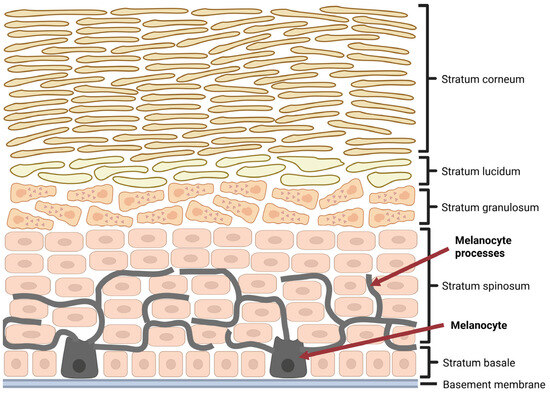 Localization of melanocytes in epidermis. Created in BioRender. Sikorski, H. (2025) https://app.biorender.com/illustrations/680f42c88ad34f409d0785d3 (accessed on 11 July 2025).