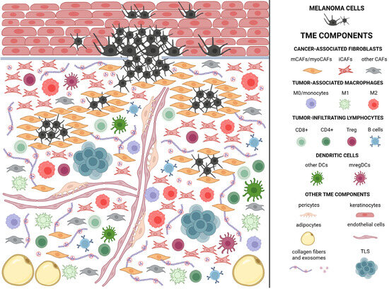 Melanoma microenvironment. Created in BioRender. Sikorski, H. (2025) https://app.biorender.com/illustrations/681ba19b77ac8eff499a4020 (accessed on 11 July 2025). The figure schematically represents the composition of the tumor microenvironment in melanoma. Numerous CAFs (cancer-associated fibroblasts) are visible, constituting the most abundant cellular component of the tumor microenvironment. Matrix CAFs (mCAFs) surround tumor cells, forming a barrier to immune cell infiltration. They also contribute to the production of the extracellular matrix and the tensioning of its structure. Immunomodulatory CAFs (iCAFs), in turn, secrete factors that promote the acquisition of a tolerogenic/immunosuppressive phenotype by immune cells. For this reason, they were presented in close proximity, forming clusters to illustrate their mutual interactions. Immune cells, as well as iCAFs that exhibit pro-tumorigenic properties, are marked in shades of red. Particular attention should also be paid to the dispersed exosomes produced by tumor cells, which play a key role in the recruitment of tolerogenic cells. These exosomes bind to collagen, ensuring their persistent presence in the tumor microenvironment. The occurrence of TLS (tertiary lymphoid structures) structures is also symbolically indicated, although their cellular composition is more complex and described in detail later in the article.