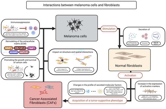 Schematic representation of the interactions between melanoma cells and fibroblasts within the tumor microenvironment. Created in BioRender. Sikorski, H. (2025) https://app.biorender.com/illustrations/6811333a9b48cfcbde3c43a8 (accessed on 11 July 2025).