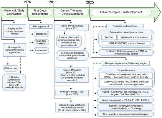 Advances in melanoma therapy: past, present, and future with a focus on the tumor microenvironment (TME). Created in BioRender. Sikorski, H. (2025) https://app.biorender.com/illustrations/6864344d6f7b03928f4b99dd (accessed on 11 July 2025).