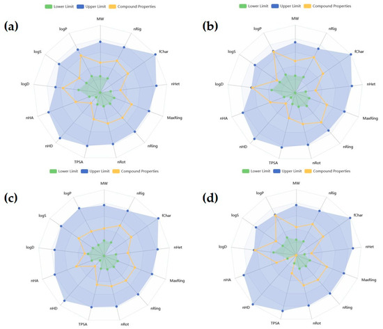Radar plot of physicochemical properties for the designed isoindoline esters. Each axis represents a distinct property relevant to drug-likeness. The blue shaded area represents the acceptable range for oral bioavailability according to the SwissADME criteria. The green central region shows the optimal range. The yellow line corresponds to the calculated values for each compound. The four aromatic amino acid derivatives (highlighted) cluster within the optimal range for CNS-active compounds. (a) ETYR; (b) ETRP; (c) EHIS; (d) EPHE.
