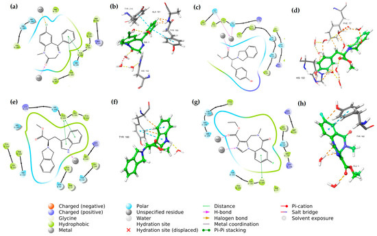 Although docking simulations were performed using the human GABAA α1β2γ2 structure, previous reports demonstrated the high sequence conservation of GABAA receptor subunits between zebrafish and mammals, particularly in the α1 and γ2 extracellular domains that form the BDZ binding site. The behavioral sensitivity of zebrafish to diazepam and flumazenil further supports the functional conservation of this site. In the absence of a high-resolution zebrafish GABAA structure, the human model provides a reliable and translationally relevant approximation for ligand–receptor interactions [54,55,56].