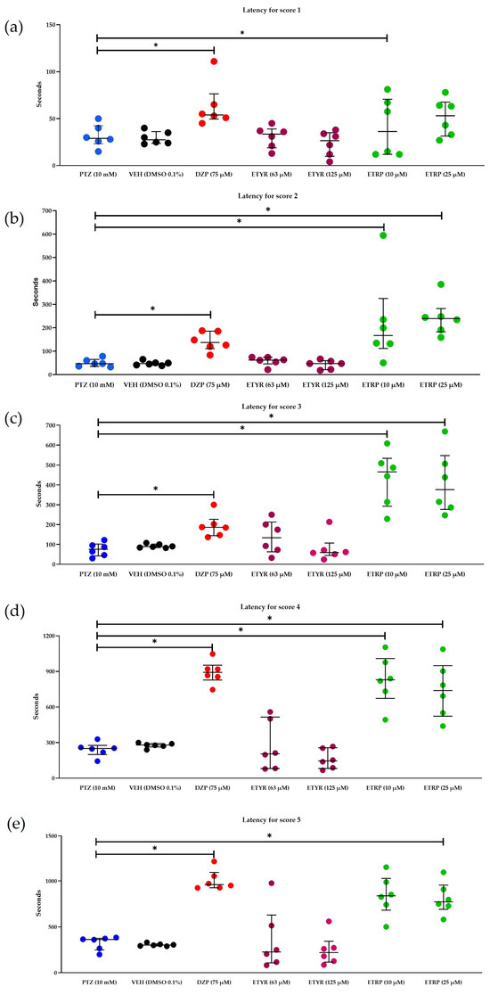 Quantification of latency scores in zebrafish treated with vehicle, diazepam, tyrosine ester, and tryptophan ester following PTZ exposure; n = 6 zebrafish for each group of treatment. (a) PTZ vs. DZP (* p = 0.004); PTZ vs. ETRP 10 µM (* p = 0.02). (b) (* p < 0.001). (c–e) (* p < 0.01). (e) Data are presented as medians ± interquartile ranges. For (a,b), the analysis was performed using ANOVA followed by Dunnet post hoc test, while for (c–e), the Kruskal–Wallis test was used, followed by the Bonferroni correction for the Mann–Whitney U test.
