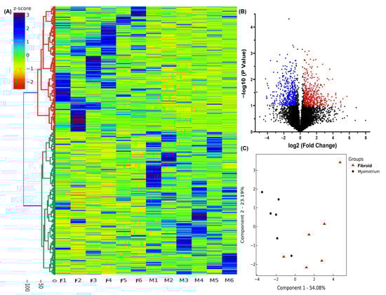 Total RNA was extracted from six paired postmenopausal fibroid and myometrial tissues using TRIzol reagent (Thermo Fisher Scientific, Waltham, MA, USA). RNA concentration and integrity were assessed with a NanoDrop 2000c spectrophotometer (Thermo Scientific, Wilmington, DE, USA) and an Agilent 2100 Bioanalyzer (Agilent Technologies, Santa Clara, CA, USA), as previously described [54,55]. Only samples with RNA integrity numbers (RIN) ≥9 were used for library preparation. One microgram of total RNA per sample was used to generate strand-specific cDNA libraries using the TruSeq protocol (Illumina, San Diego, CA, USA) following the manufacturer’s instructions. RNA sequencing was performed at the UCLA Technology Center for Genomics & Bioinformatics. Bioinformatics analysis was conducted as previously described [24,29]. For quality control FastQC was used to check the quality of raw fastq data from sequencing core and after adaptor cut and quality trimming [56]. The sequencing reads were mapped by STAR 2.7.9a [57] and read counts per gene were quantified using the human genome GRCh38. RNA-seq count data were normalized using the DESeq2 R package (version 1.38.3) [58]. Differential gene expression was visualized using hierarchical clustering and TreeView analysis, volcano plots, and principal component analysis (PCA) using Flaski (version 3.19.3) [59]. Functional enrichment analyses, including gene ontology (GO) and KEGG pathway analysis, were performed using NcPath, which integrates data from org.Hs.eg.db (release 3.11), miRBase v22.1, miRTarBase v8, RNAinter, and NPInter v4.0 [60]. The observed expression differences were deemed robust and suitable for downstream statistical analysis. The RNA sequencing dataset is publicly available in the Gene Expression Omnibus (GEO) under accession number GSE302523.