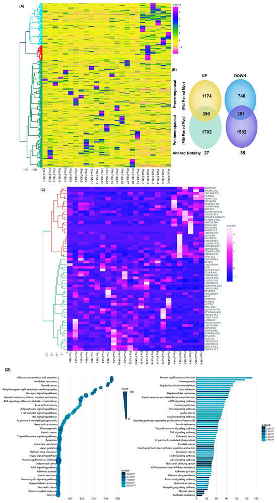 Next, we compared the differential expression of lncRNAs identified in this postmenopausal dataset with our previously published premenopausal dataset (GSE224991). This comparative analysis, based on the fold change in expression between Fib and paired Myo, identified 1200 differentially expressed lncRNAs, of which 741 showed altered expression in postmenopausal samples. Specifically, 390 lncRNAs were upregulated and 351 were downregulated by at least 1.5-fold in postmenopausal compared to premenopausal samples. Hierarchical clustering and TreeView analysis distinctly separated these lncRNAs by menopausal status (Figure 2A). The comparison between premenopausal and postmenopausal RNA-seq data is illustrated in the pie chart (Figure 2B). Furthermore, we identified 62 lncRNAs that exhibited greater than 1.5-fold change in expression exclusively in the postmenopausal group (Figure 2B,C). Gene ontology (GO) and KEGG pathway enrichment analysis of these 62 lncRNAs indicated predominant roles in the regulation of the actin cytoskeleton, focal adhesion, and the mTOR and FoxO signaling pathways (Figure 2D).