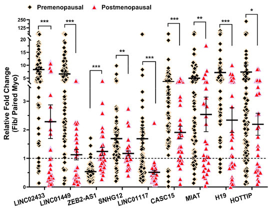 Expression of lncRNAs for SNHG12, LINC02433, LINC01449; ZEB2-AS1, LINC01117, and CASC15; H19, HOTTIP, and MIAT expressed as fold change (fib/paired myo) in premenopausal (n = 84) and postmenopausal group (n = 31) by qRT-PCR. The results are presented as mean ± SEM with p values (* p < 0.05; ** p < 0.01; *** p < 0.001) as indicated by the corresponding lines.