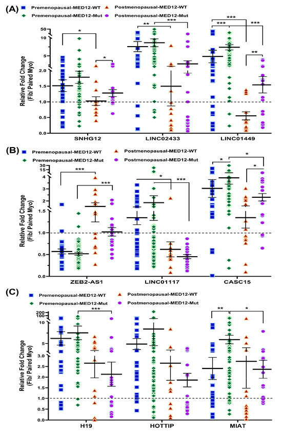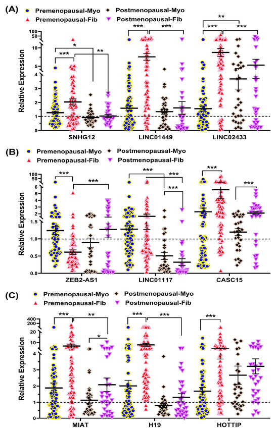 Expression of select lncRNAs in myometrium (myo) and paired fibroids (fib) in premenopausal (n = 84) and postmenopausal group (n = 31) as assessed by qRT-PCR. (A) SNHG12, LINC02433, LINC01449; (B) ZEB2-AS1, LINC01117, CASC15; (C) H19, HOTTIP, and MIAT. Results are presented as mean ± SEM with p values (* p < 0.05; ** p < 0.01; *** p < 0.001), indicated by corresponding lines.
