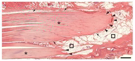 Low-power photomicrograph of a representative 5 µm thick, H&E-stained section of the left common calcaneal tendon from a rabbit without surgery or treatment. Further details are provided in the text. The scale bar represents 1 mm. Asterisks indicate tendon tissue, arrows point to the peritenon, and squares mark surrounding adipose tissue. Arrowheads highlight regions where the CCT left the plane of section.