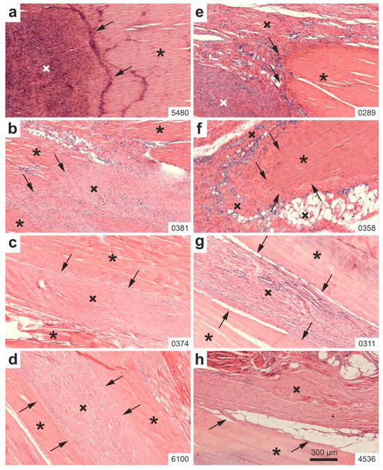 Representative high-power photomicrographs of 5 µm thick, H&E-stained sections of the right common calcaneal tendon (surgery, treatment or sham treatment side) from two rabbits each in Group 1 (UA-ADRCs/W4) (a,b), Group 2 (UA-ADRCs/W12) (c,d), Group 3 (sham/W4) (e,f), and Group 4 (sham/W12) (g,h). Asterisks indicate original tendon tissue; black and white crosses denote newly formed connective tissue; arrows mark the boundary between the original tendon and the newly formed tissue. Numbers in the lower right corner of each panel indicate individual animal IDs according to the study protocol. The scale bar in panel (h) represents 300 µm and applies to all panels. Further details are provided in the text.