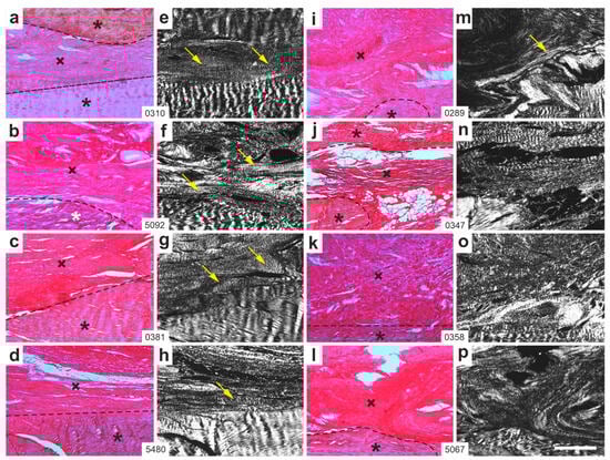 Representative polarization photomicrographs of 5 µm thick sections of the right common calcaneal tendon (surgery, treatment or sham treatment side) from rabbits in Group 2 (UA-ADRCs/W12) (a–h) and Group 4 (sham/W12) (i–p), stained with Picrosirius Red. Panels (a–d,i–l) were captured under brightfield microscopy; panels (e–h,m–p) show the corresponding fields of view imaged under polarization microscopy. Asterisks mark original tendon tissue; crosses indicate newly formed connective tissue; dashed lines delineate the boundary between the two. Yellow arrows highlight areas of organized, firm connective tissue with visible crimp patterns within the newly formed tissue. Numbers in the white boxes linking each pair of corresponding panels (a/e,b/f,c/g … l/p) indicate individual animal IDs according to the study protocol. The scale bar in panel (p) represents 500 µm and applies to all panels. Further details are provided in the text.