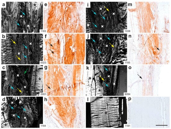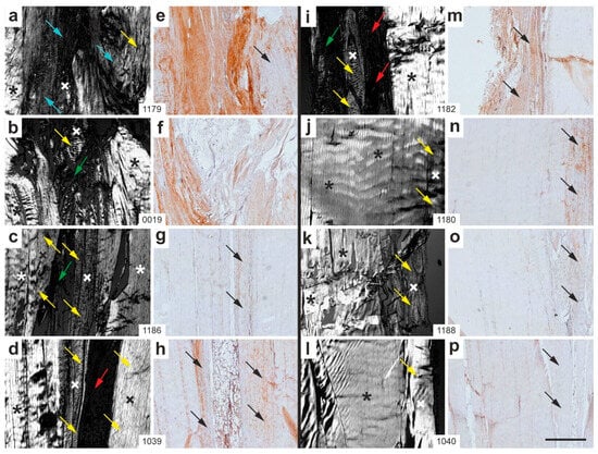 Representative polarization photomicrographs of 5 µm thick sections of the right common calcaneal tendon from all rabbits in Group 6 (sham/W12), stained with Safranin O/Fast Green at the site of surgery and sham treatment (a–d,i–l), along with corresponding immunohistochemical photomicrographs detecting aggrecan (e–h,m–p). The order of the animals (a/e,b/f,c/g … l/p) corresponds to that shown in Figure 10c (from left to right). Black and white asterisks mark original tendon tissue; black and white crosses indicate newly formed connective tissue. Yellow arrows highlight newly formed connective tissue displaying the characteristic crimp pattern of tendons; blue arrows indicate newly formed tissue lacking this pattern; green arrows point to loose connective tissue and artifacts; black arrows denote newly formed connective tissue in the immunohistochemical images that corresponds to tendon-like crimp structures observed in the polarization photomicrographs. Numbers in the white boxes connecting each pair of corresponding panels (a/e,b/f,c/g … l/p) indicate individual animal IDs according to the study protocol. The scale bar in panel (p) represents 500 µm and applies to all panels. Further details are provided in the text.