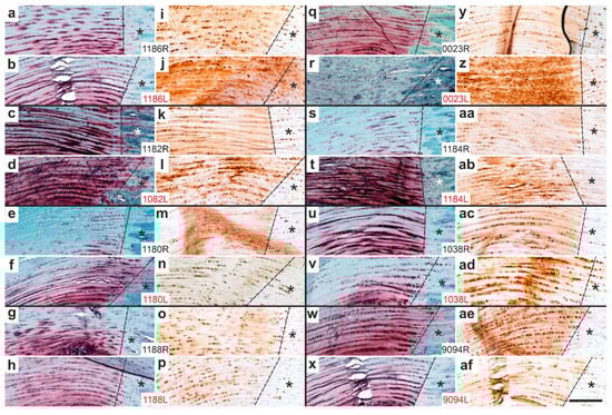 Representative low-magnification photomicrographs of 5 µm thick sections of the right (surgery, treatment or sham treatment) distal common calcaneal tendon (CCT) at the site of calcaneal insertion (comparable to Figure 13), stained with Safranin O/Fast Green (a–h,q–x) or processed for immunohistochemical detection of aggrecan (i–p,y–af) from all rabbits in Group 5 (UA-ADRCs/W12) (a–p) and Group 6 (sham/W12) (q–af). The order of the animals (a/i,b/j,c/k … x/af) matches that shown in Figure 10a,c (left to right). Arrows mark the transition from the CCT to the calcaneus. Asterisks indicate additional aggrecan immunolabeling in the CCT at sites corresponding to the formation of sesamoid fibrocartilage, as well as the respective regions in the Safranin O/Fast Green-stained sections (black and red asterisks are defined in the main text). Numbers in the white boxes linking each pair of corresponding panels (a/i,b/j,c/k … x/af) indicate individual animal IDs according to the study protocol. The scale bar in panel (af) represents 1 mm and applies to all panels. Further details are provided in the text.