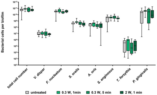 Impact of diode laser treatment on bacterial cell numbers in a subgingival seven-species biofilm. Whisker’s boxplots (5th to 95th centile) showing cell numbers of all species determined by qRT-PCR from three independent experiments and four replicates, each (N = 12).